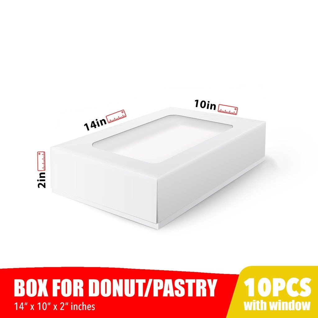 THE BOX: These pretty white boxes are perfect for keeping all your delicious baked goods safe while on the go. With a 14" Length x 10" Width x 2" Height, they are a great size for storing freshly baked pizza, donuts, cakes, pies, cupcakes, muffins, cookies, chocolate covered fruit, and bagels and keeping them away from the mess and from getting dirty.